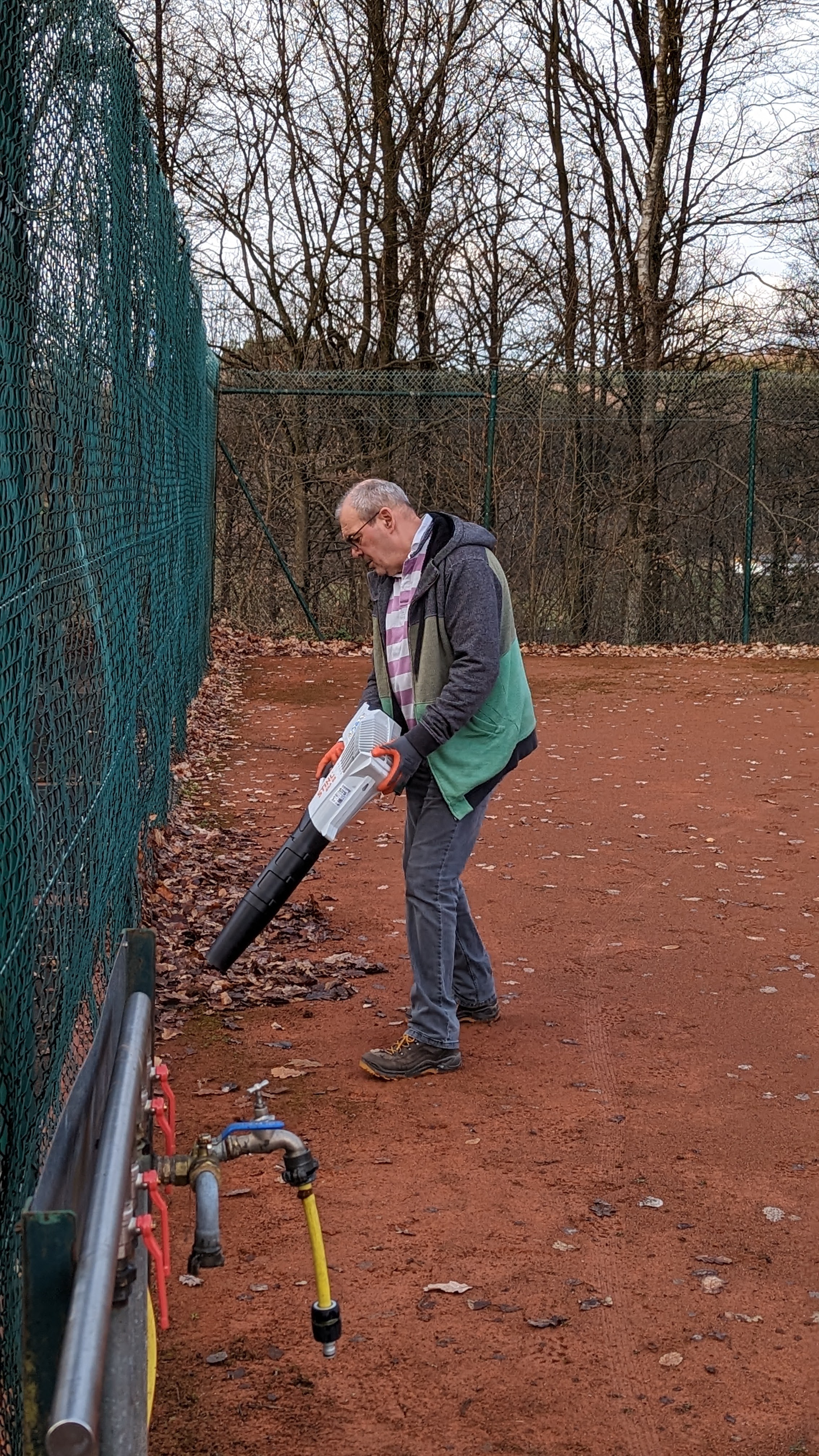 Beim ersten Arbeitseinsatz zur Vorbereitung auf die Sommersaison war die Beteiligung so gut, dass alle Vorbereitungen für den Platzbauer erfolgreich abgeschlossen werden konnten. Es wurden die Steine von den Plätzen abgeräumt, Laub beseitigt, gefegt, aufgeräumt und die Dachrinnen vom Laub befreit. Alle waren nach dem Winter schon in froher Erwartung auf die Saisoneröffnung. Jetzt kann der Platzbauer die Plätze herrichten. Mitte April folgen weitere Arbeitseinsätze zur Inbetriebnahme der Plätze, damit es dann Ende April wieder heißt: „Spiel, Satz und Sieg!“